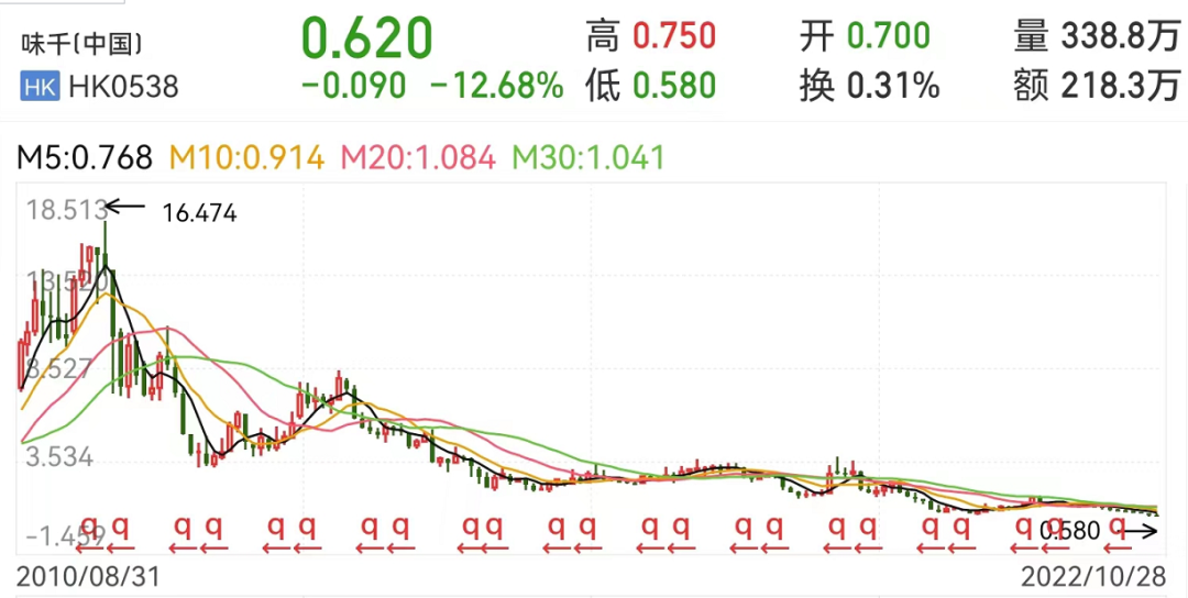 不到一萬(wàn)的交易量,意味著味千在股市徹底失去了流動(dòng)性,資本都不再關(guān)注它了。