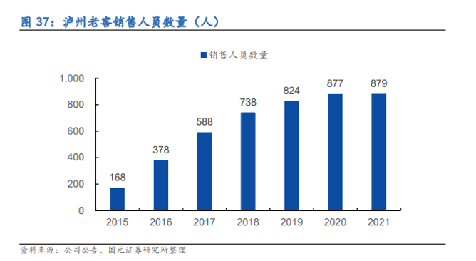 這一點,得益于2015年后,瀘州老窖大力進行渠道和銷售模式調整,渠道策略轉向更適合渠道下沉和大單品策略的“品牌專營”模式,銷售層級縮減,銷售人員數量大幅增加。特別是2019年后,其堅定實施終端配額制和價格熔斷機制,渠道庫存持續(xù)優(yōu)化。