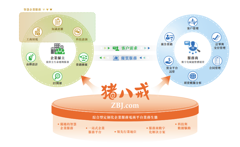 同時,豬八戒網(wǎng)開展“數(shù)據(jù)海洋+鉆井平臺”等戰(zhàn)略,基于此前近10年積累的大數(shù)據(jù),上線延伸服務(wù),包括工商注冊、代理記賬、稅務(wù)代辦、資質(zhì)代辦、稅務(wù)咨詢、商標(biāo)及版權(quán)等業(yè)務(wù),基本形成了“智能企業(yè)服務(wù)”。