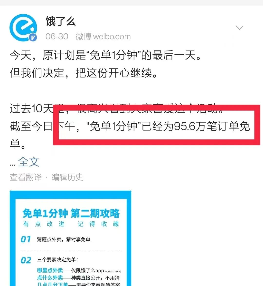 今年6月,餓了么免單一分鐘活動(dòng)爆火出圈,在首期十天左右的活動(dòng)期間,餓了么的服務(wù)器幾度被擠爆,為95.6萬(wàn)余筆訂單免單,涉及的商戶多達(dá)30多萬(wàn)家。除了消費(fèi)者和商家,免單活動(dòng)最大的受益者當(dāng)然是餓了么自己。