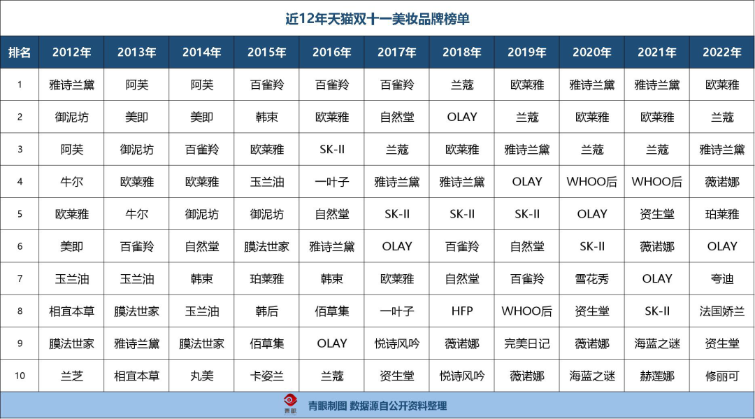 2020年,天貓雙十一美妝前十品牌分別來自于歐萊雅集團(歐萊雅、蘭蔻)、雅詩蘭黛集團(雅詩蘭黛、海藍之謎)、LG生活健康(Whoo后)、寶潔(OLAY、SK-II)、愛茉莉太平洋(雪花秀)、資生堂集團(資生堂)、貝泰妮(薇諾娜)。2021年榜單與2020年相差無幾,僅是由歐萊雅集團旗下的赫蓮娜替換了雪花秀。