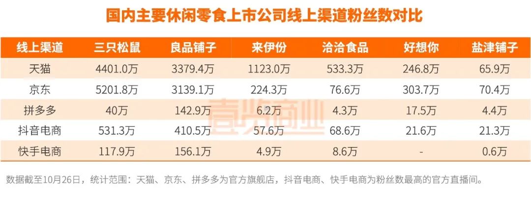 線上部分,電商起家的三只松鼠在渠道布局上始終引領(lǐng)著行業(yè),目前形成了天貓系、京東系“兩超”和其他電商平臺(tái)“多強(qiáng)”的經(jīng)營(yíng)格局。