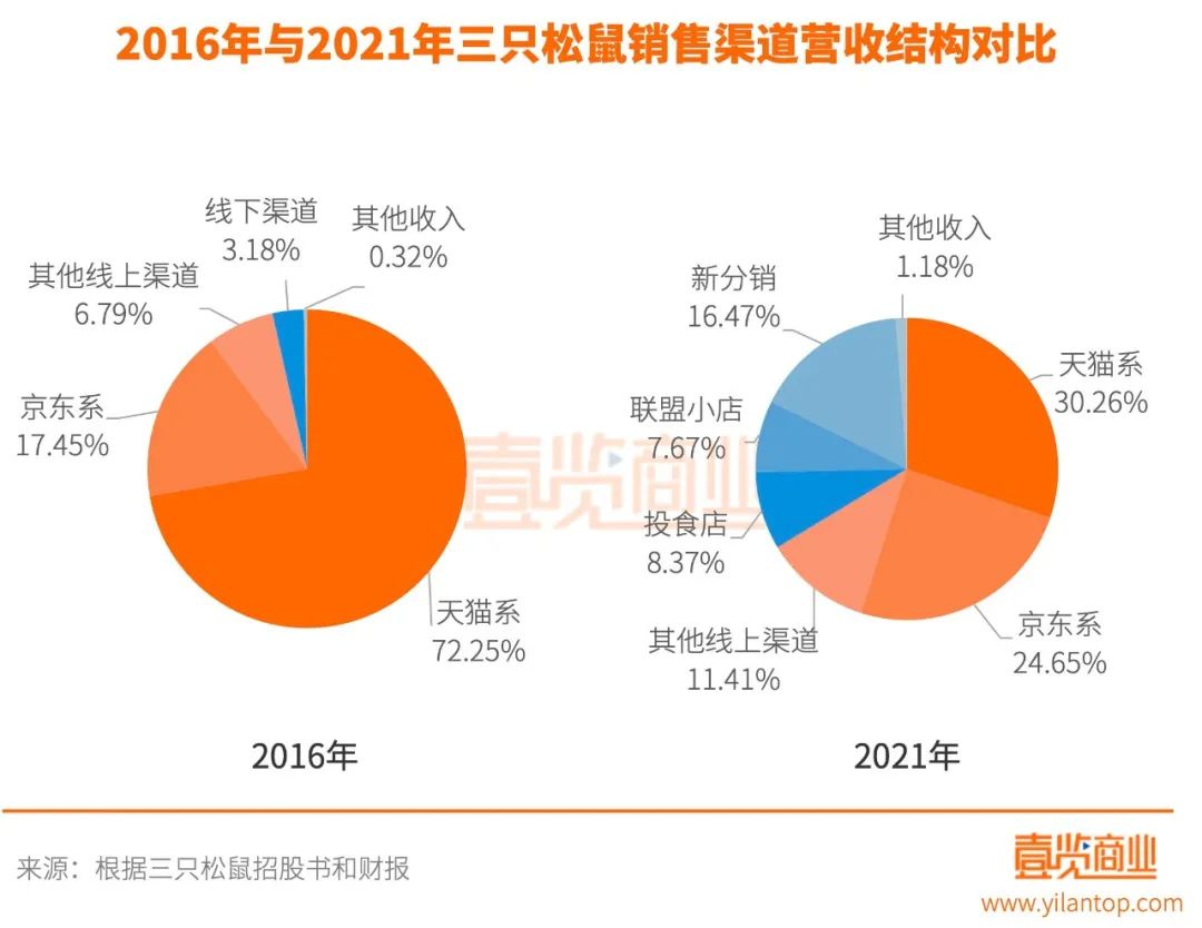 三只松鼠敏銳地意識(shí)到,線下和直播電商才是新的機(jī)會(huì)點(diǎn),需要積極主動(dòng)求變。經(jīng)過(guò)三年左右的努力,三只松鼠基本完成了線上線下的均衡布局。招股書(shū)數(shù)據(jù)顯示,2016年及之前,三只松鼠線上營(yíng)收占比高達(dá)95%以上,其中天貓系占比70%以上,銷(xiāo)售渠道集中度較高。而到了2021年,其線上營(yíng)收占比降至66.31%,線下?tīng)I(yíng)收占比升至33.69%,銷(xiāo)售渠道營(yíng)收分布趨于合理。
