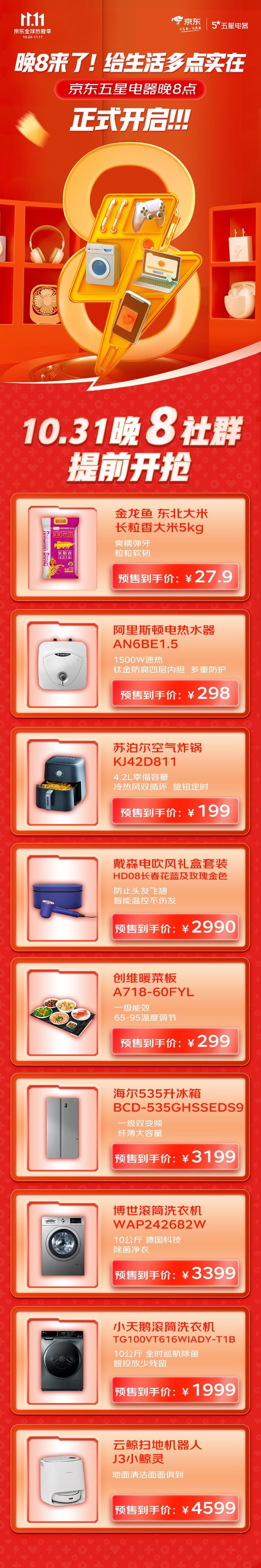 “11.11"線(xiàn)上京東晚8點(diǎn)即將迎來(lái)全面放價(jià),不少消費(fèi)者早已摩拳擦掌準(zhǔn)備將心儀的品質(zhì)好貨帶回家。京東五星電器、京東電器線(xiàn)下門(mén)店也同步推出“晚8超級(jí)秒殺日”現(xiàn)時(shí)狂歡。大家電方面,多款性?xún)r(jià)比爆款限量供應(yīng),比如說(shuō)一級(jí)雙變頻纖薄大容量海爾535升冰箱促銷(xiāo)價(jià)3199元;10公斤除菌凈衣博世滾筒洗衣機(jī)活動(dòng)價(jià)3399元;10公斤全時(shí)巡航除菌小天鵝滾筒洗衣機(jī)到手價(jià)1999元;1500W速熱阿里斯頓電熱水器AN6BE1.5活動(dòng)價(jià)298元;簡(jiǎn)單易操作,非常適合買(mǎi)給老人使用。網(wǎng)紅生活小家電更以低價(jià)風(fēng)暴來(lái)襲,像4.2L冷熱風(fēng)雙循環(huán)旋鈕定時(shí)蘇泊爾空氣炸鍋KJ43D811秒殺價(jià)199元;智能溫控不傷發(fā)戴森電吹風(fēng)禮盒套裝HD08長(zhǎng)春花藍(lán)及玫瑰金色搶購(gòu)價(jià)2990元;一級(jí)能效65-95溫度調(diào)節(jié)創(chuàng)維暖菜板A718-60FYL勁爆價(jià)299元;地面清潔面面俱到云鯨掃地機(jī)器人J3小鯨靈折扣價(jià)4599元;讓日常工作忙碌的上班一族生活精致感和解放雙手兼得。還有預(yù)售價(jià)為27.9元的5KG金龍魚(yú)東北長(zhǎng)粒大米等日常生活必需品,數(shù)量有限,先搶先得。