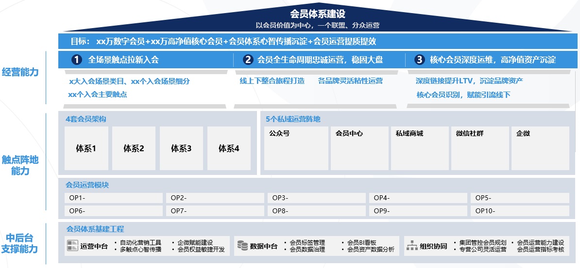 品牌經(jīng)營能力包括會員忠誠度計劃,核心會員的深度運維策略、全場景拉新、會員入會機制等;觸點陣地建設(shè)能力包括公眾號、會員中心、私域商城、社群、企業(yè)微信等;中后臺協(xié)同支撐能力包括了:運營中臺、數(shù)據(jù)中臺、組織協(xié)同等內(nèi)容。所以會員運營是企業(yè)一項體系化的工程,我們需要把運營策略、IT工具、高技能人員對齊,才能達到想要的業(yè)務(wù)結(jié)果。