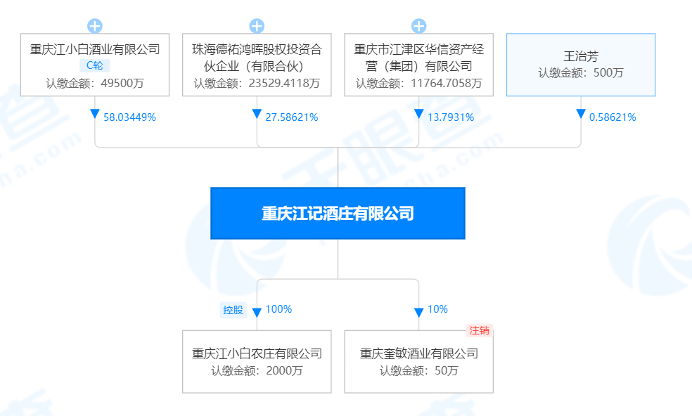 除了以上幾點,新消費Daily查詢天眼發(fā)現(xiàn),目前,華信集團已認繳出資額約1.18億元,持股比例為13.79%,成為江記酒莊第三大股東,值得注意的是,重慶江記酒莊有限公司的核心產品是梅見+江小白。