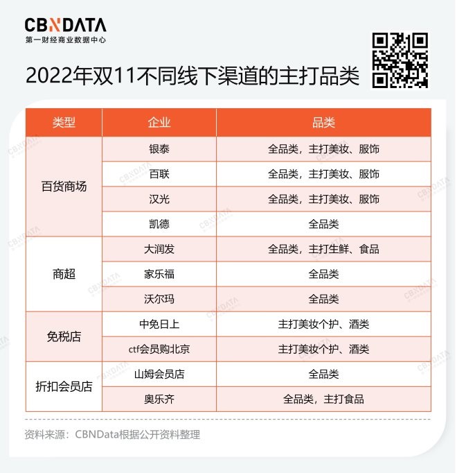 從品類來看,線下渠道雙11的主打品類延續(xù)了平日的強勢品類。比如百貨商場主打美妝和鞋服,免稅店主打美妝和酒類,大潤發(fā)等超市以食品生鮮主打,奧樂齊則主打食品。