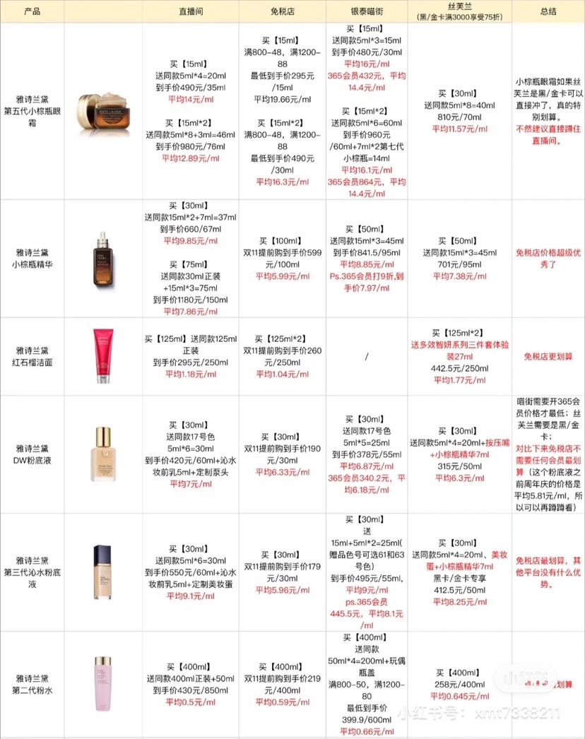 在小紅書上,不少博主雙11預(yù)售之前就開始做攻略,將明星產(chǎn)品在線下商場、免稅店與李佳琦直播間預(yù)售首日的價格進行對比,進而得出“最低價”。以線上線下爭奪最為激烈的美妝品類為例,小紅書用戶“沐沐口紅修復”在對比各渠道價格(含贈品)后得出:免稅店的雅詩蘭黛小棕瓶精華價格最低、海藍之謎濃縮精華和蘭蔻菁純面霜在銀泰喵街最劃算……不少博主在比價后感慨“比佳琦直播間還便宜”“直播間剁手先緩緩”。
