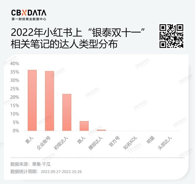與電商渠道的流量轉(zhuǎn)化極度依賴頭部達人、KOL不同,線下渠道的流量更多依賴所在城市、社區(qū)的居民。以銀泰為例,根據(jù)果集·千瓜數(shù)據(jù),關(guān)于“銀泰雙十一”的種草筆記中,來自素人、企業(yè)賬號、初級達人、路人的筆記數(shù)量占據(jù)了絕大多數(shù)。除了商場和品牌的企業(yè)號,自發(fā)的路人和素人成為銀泰雙11線上流量的主要來源。