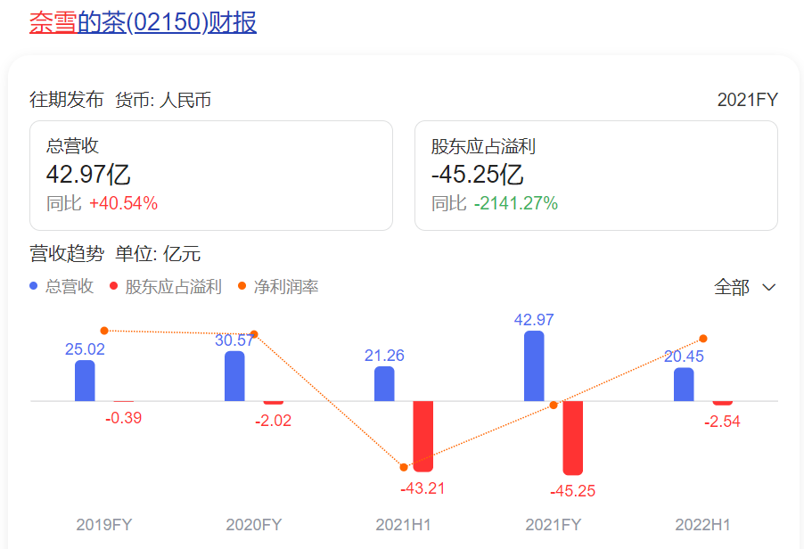 而作為新茶飲賽道中唯一的上市公司,據2022半年報顯示,奈雪上半年收入20.44億元,同比下滑3.8%,經調整凈虧損2.49億元,較去年同期的0.48億元盈利大幅下降618.75%。雖然曾短暫有過盈利,但上市后的奈雪仍處于持續(xù)虧損的狀態(tài)。