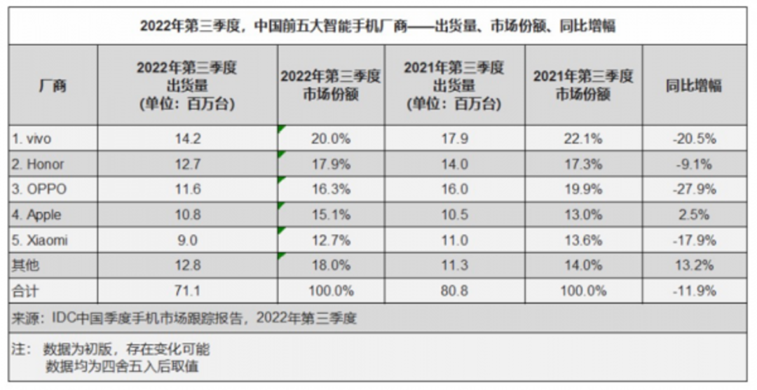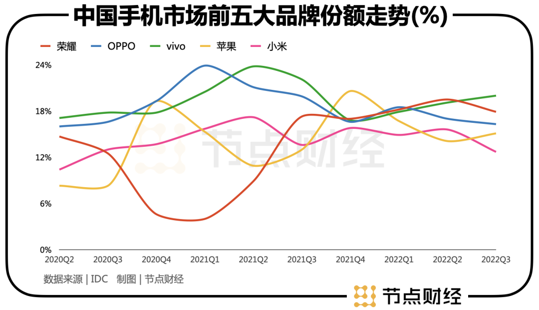 同時,在2021年Q3-2022年Q3的四個季度中,ov和小米的份額都出現(xiàn)了下滑,只有榮耀和蘋果的份額還在上升。