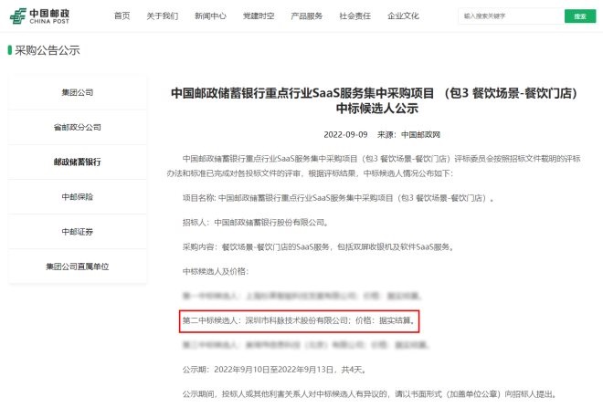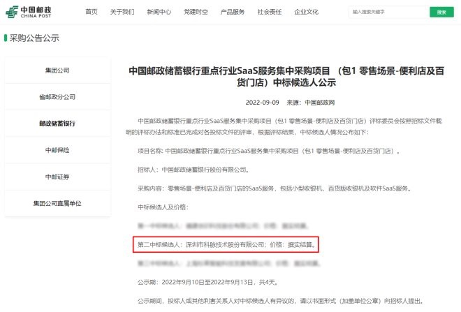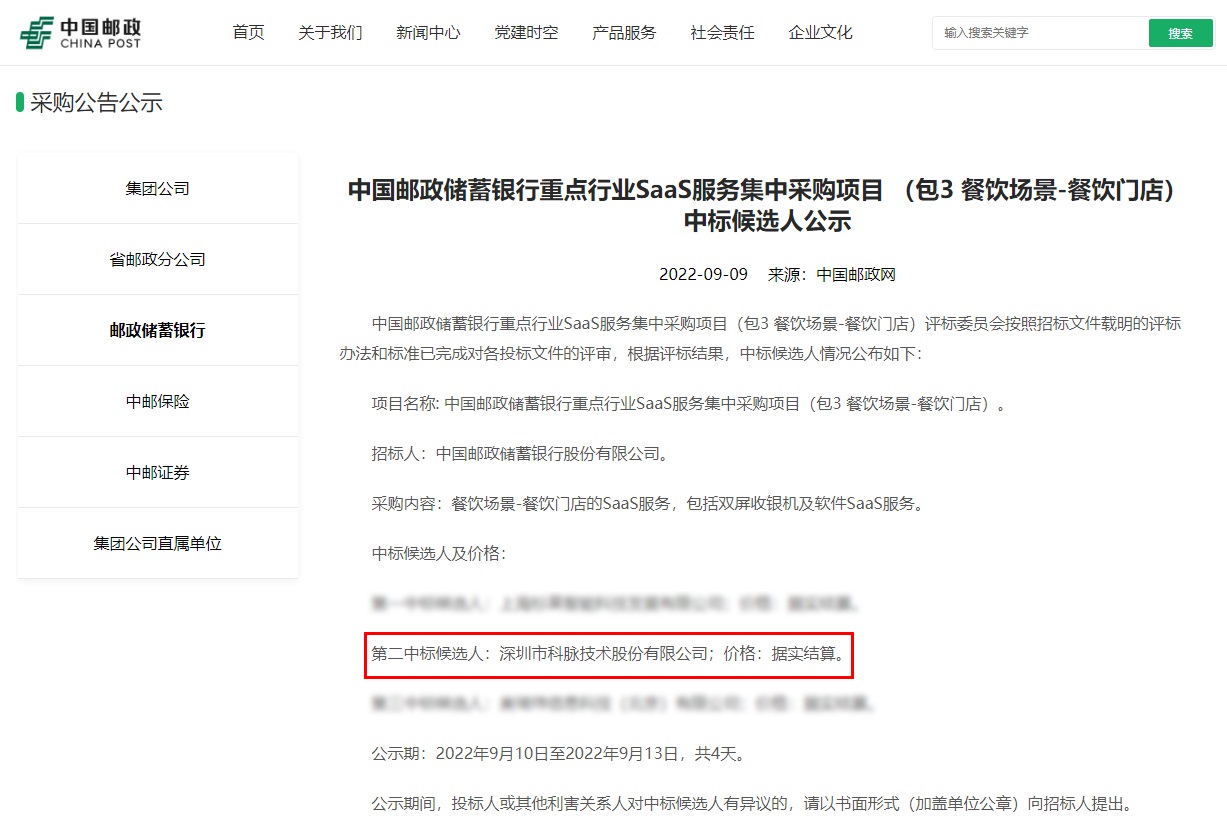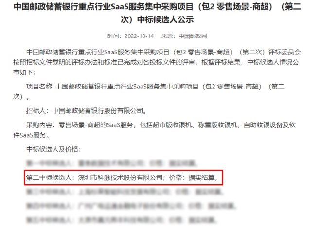 今年9月,中國(guó)郵政儲(chǔ)蓄銀行重點(diǎn)行業(yè)SaaS服務(wù)集中采購(gòu)項(xiàng)目“零售場(chǎng)景-便利店及百貨門店”、“零售場(chǎng)景-商超”及“餐飲場(chǎng)景-餐飲門店”完成投標(biāo)文件評(píng)審,根據(jù)評(píng)標(biāo)結(jié)果,深圳市科脈股份技術(shù)有限公司在與眾多優(yōu)秀的數(shù)字化服務(wù)商之間的激烈角逐中成功脫穎而出,即將攜手中國(guó)郵政銀行打造SaaS服務(wù),提供包括小型收銀機(jī)、百貨版收銀機(jī)、雙屏收銀機(jī)、超市版收銀機(jī)、稱重版收銀機(jī)、自助收銀設(shè)備及軟件SaaS服務(wù)。