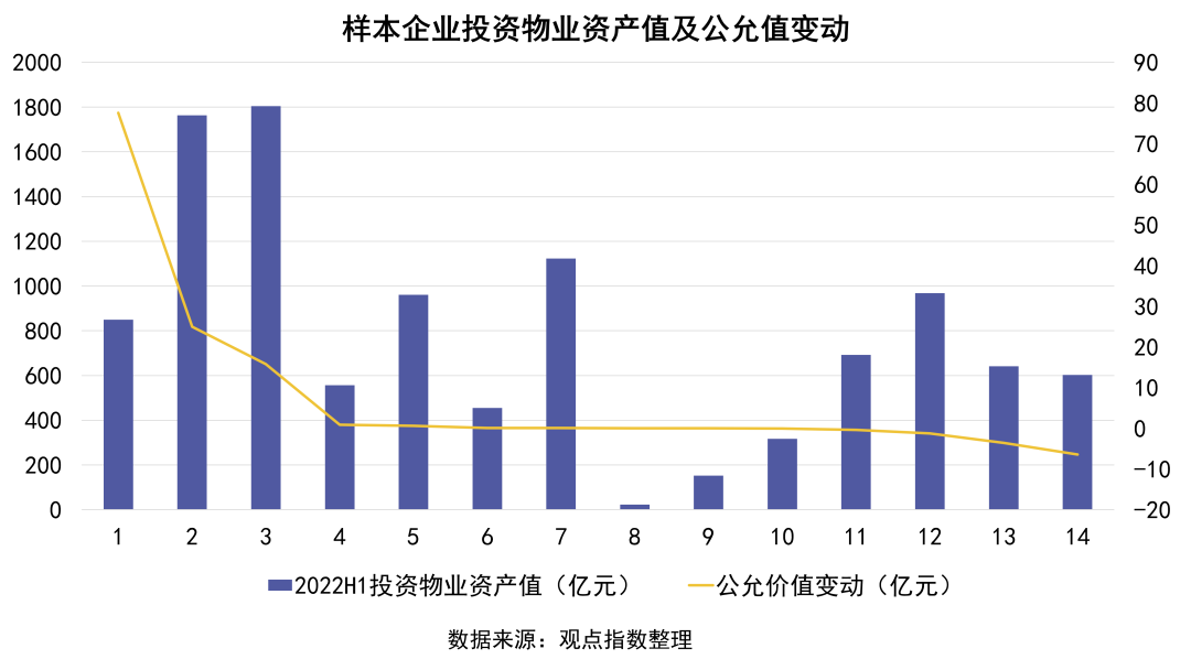 為了更具體分析企業(yè)的投資物業(yè)資產(chǎn)值情況,觀點指數(shù)在研究樣本中抽取了14家上市企業(yè)進行對比分析。