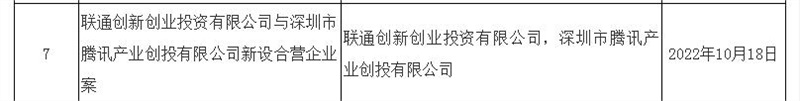 11月2日消息,據(jù)國(guó)家市場(chǎng)監(jiān)管總局官網(wǎng)10月27日發(fā)布的《2022年10月17日-10月23日無條件批準(zhǔn)經(jīng)營(yíng)者集中案件列表》顯示,聯(lián)通創(chuàng)新創(chuàng)業(yè)投資有限公司與深圳市騰訊產(chǎn)業(yè)創(chuàng)投有限公司新設(shè)合營(yíng)企業(yè)案獲無條件批準(zhǔn),審結(jié)時(shí)間為10月18日。