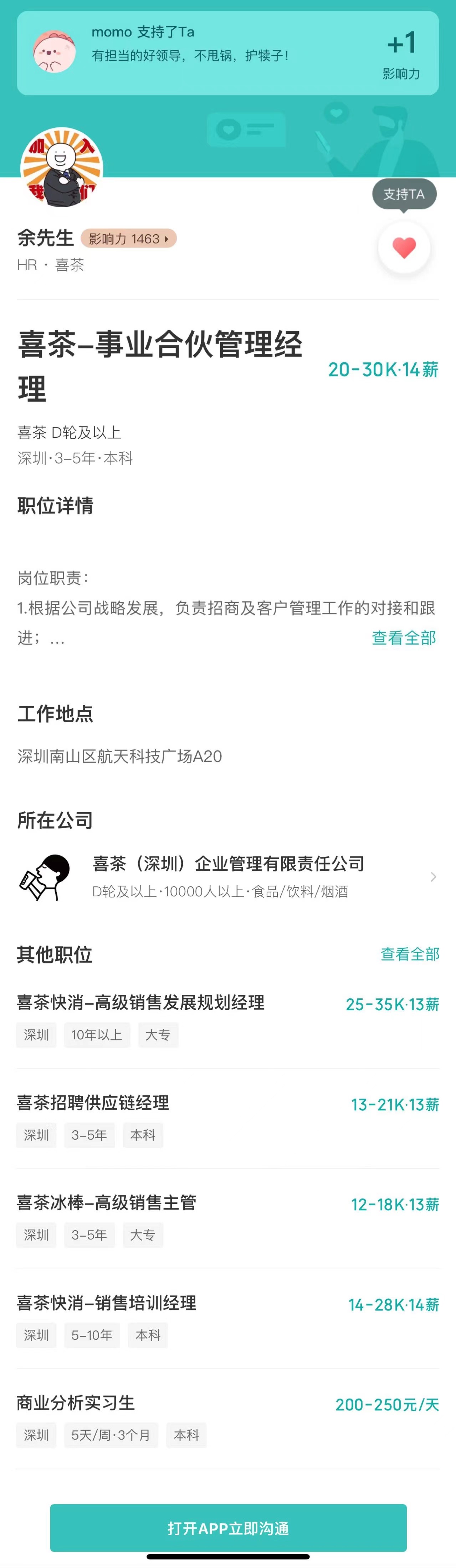 《聯(lián)商網(wǎng)》在Boss直聘上發(fā)現(xiàn),喜茶關(guān)聯(lián)公司新近放出“事業(yè)合伙管理經(jīng)理”崗位,職責(zé)包括“根據(jù)公司戰(zhàn)略發(fā)展,負(fù)責(zé)招商及客戶管理工作的對(duì)接和跟進(jìn)”,以及“意向客戶的開拓、洽談、篩選、審核、締約、維護(hù)工作;協(xié)助跟進(jìn)事業(yè)合伙門店的開店進(jìn)度”,并在任職資格中明確規(guī)定應(yīng)聘者須有“三年以上知名連鎖行業(yè)加盟商管理經(jīng)驗(yàn)”。從上述信息看,喜茶此舉或在為放開加盟業(yè)務(wù)做準(zhǔn)備。