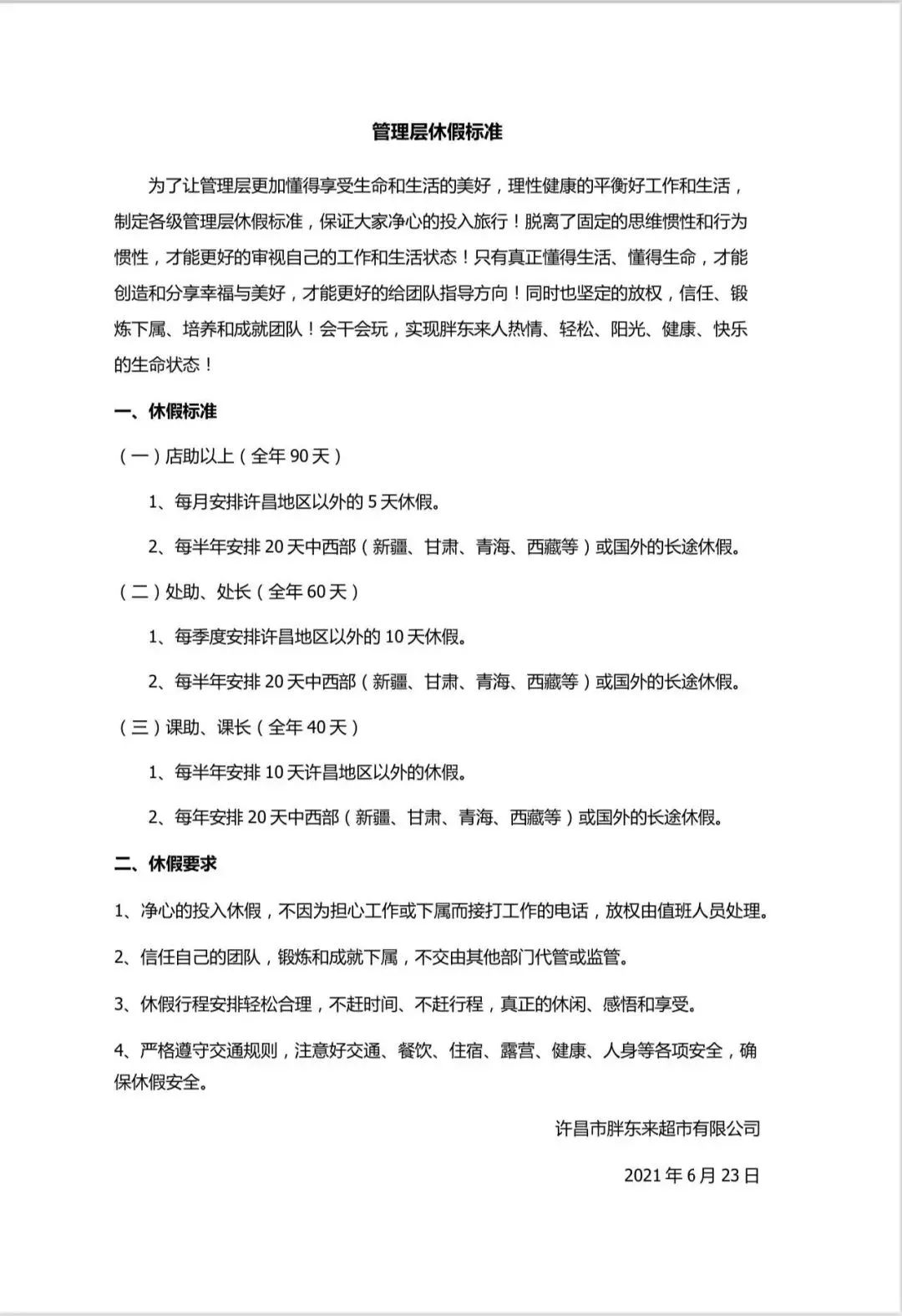 去年7月,胖東來公布的《管理層休假標(biāo)準(zhǔn)》可謂是羨煞眾人——胖東來的員工凡在店助以上級別的一年可享90天休假,處助、處長全年可享6天,課助、課長全年可享40天。在當(dāng)下這個996橫行、強(qiáng)調(diào)狼性文化、大談特談奉獻(xiàn)的企業(yè)文化圈層里,不內(nèi)卷、胖東來反倒像個”異類”