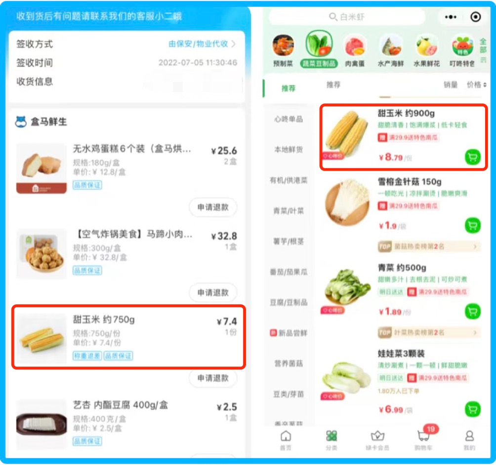 盒馬鮮生(左)與叮咚買菜甜玉米價(jià)格對(duì)比