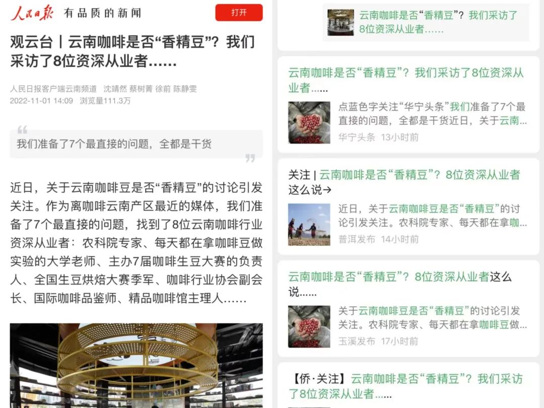 11月1日,人民日報(bào)客戶端專程采訪了包含農(nóng)科院專家、咖啡生豆大賽負(fù)責(zé)人在內(nèi)的7位云南從業(yè)者,通過問答的形式發(fā)文,客觀展示了云南咖啡的真實(shí)現(xiàn)狀,數(shù)十家媒體/自媒體賬號先后轉(zhuǎn)發(fā)。