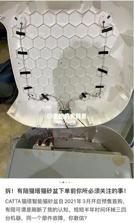 今年6月,有鏟屎官在小紅書上吐槽,有陪家的CATTA貓塔智能貓砂盆在短短半年內(nèi)壞掉三四臺機器,每次都是同一個部件出故障,可謂是刷新認知。保修期過后,智能貓砂盆又壞了,該網(wǎng)友就自行拆開機器,看看是什么情況。