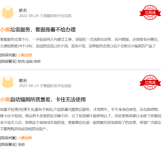 還有很多消費者訴諸黑貓投訴平臺,主要涉及質(zhì)量差、售后差等問題。不少人表示,在買有陪產(chǎn)品的一年內(nèi),不斷換新,不斷壞,產(chǎn)品缺陷始終不修復(fù),非常磨人。在Catlink、小佩寵物的投訴頁面,很多網(wǎng)友反映其售后服務(wù)不行,產(chǎn)品出現(xiàn)質(zhì)量問題后,客服拖時間,不愿維修處理。