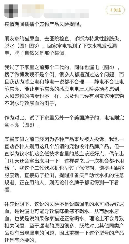 小佩智能寵物飲水機出問題的事件并非孤例。有網(wǎng)友反映,自家的小佩飲水機電源突然爆炸,插頭上的蓋子直接燒焦炸開,幸好當(dāng)時他和貓正在樓下睡覺,才沒造成更大傷害。還有網(wǎng)友表示,朋友家的貓尿血,去醫(yī)院檢查,診斷為特發(fā)性膀胱炎、脫水,回家用電筆檢測了后才發(fā)現(xiàn),買的智能飲水機漏電。
