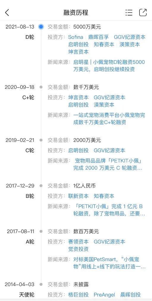去年8月,小佩寵物宣布獲得D輪5000萬美元融資,由Sofina、鼎暉百孚領(lǐng)投,GGV紀源資本、啟明創(chuàng)投等投資方跟投。這是小佩寵物繼2014年以來的第六輪融資,在中國寵物行業(yè),它可以進入2021年單筆融資規(guī)模的前五名。