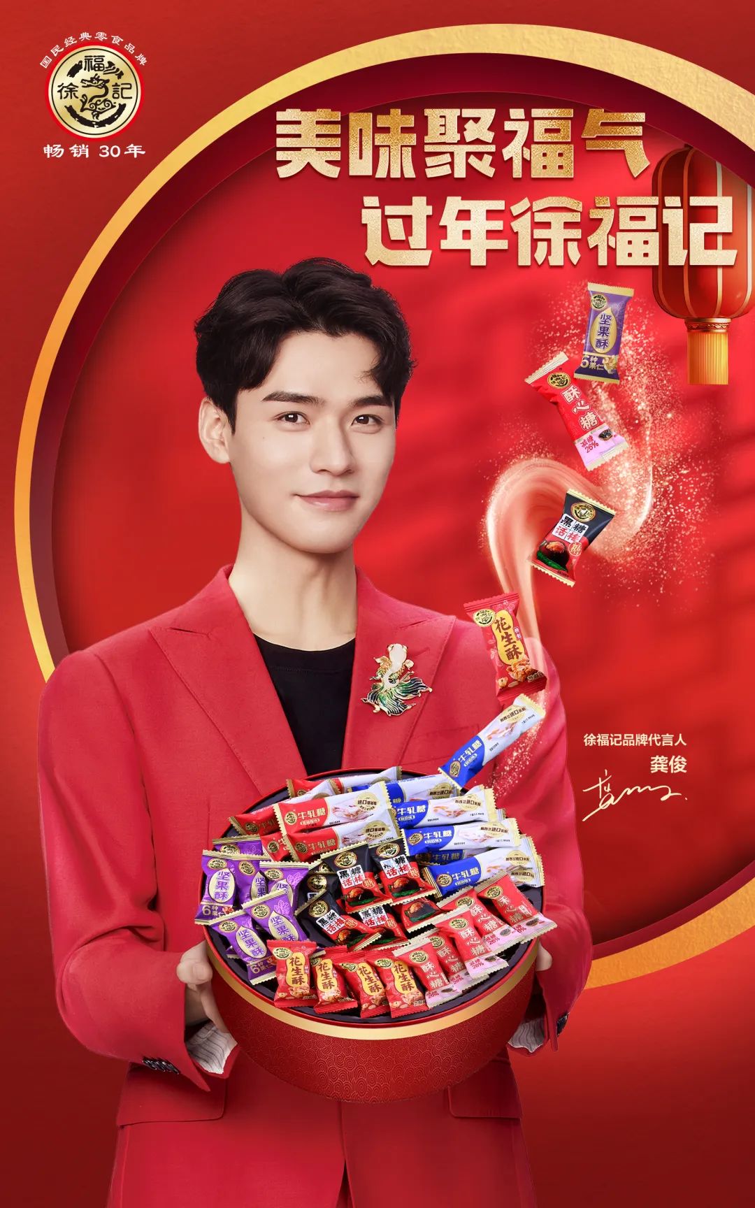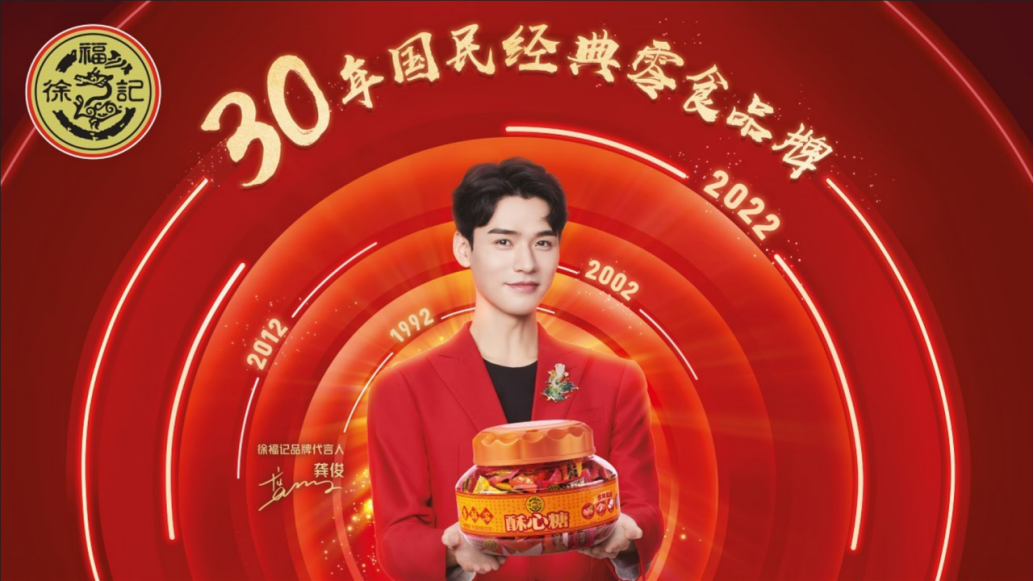 成立30周年之際,徐福記更是宣布了新的品牌口號:“美味聚福氣,天天徐福記”,并攜手龔俊成為品牌代言人。