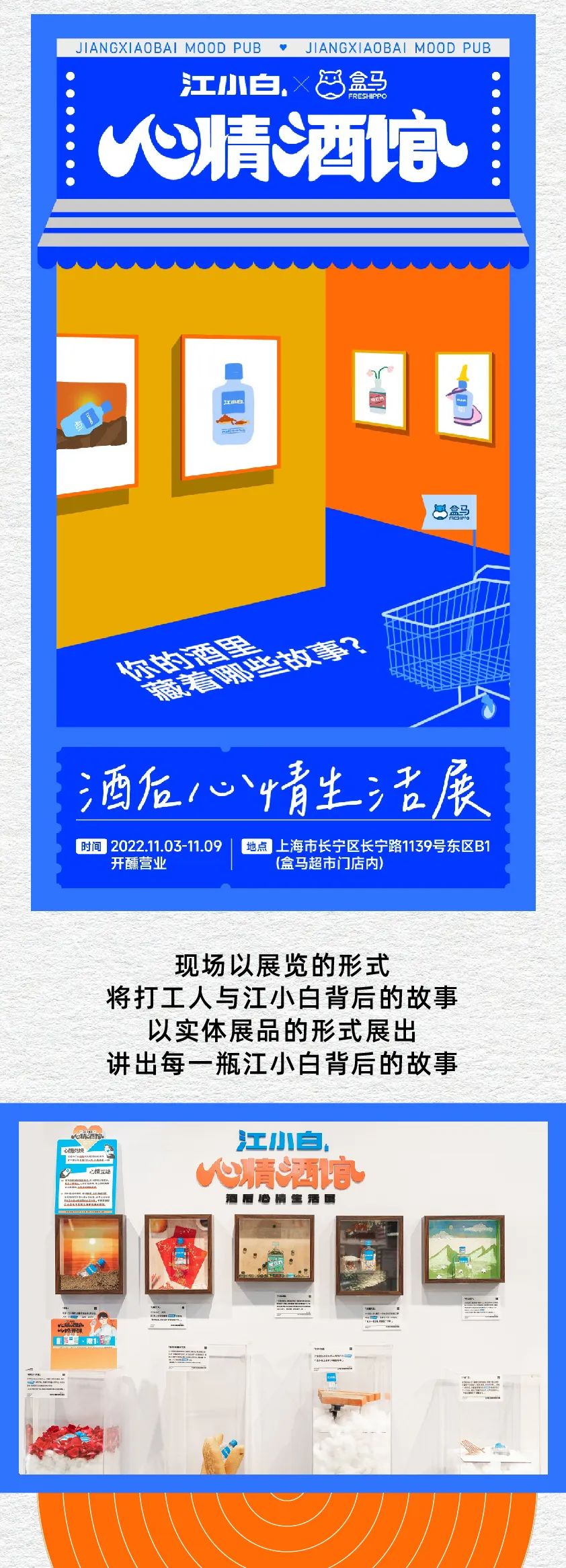 近日,江小白聯(lián)合盒馬推出首個線下“心情酒館”主題酒后心情生活展,時間為11月3日-11月9日,地點(diǎn)位于上海長寧來福士盒馬店內(nèi)。