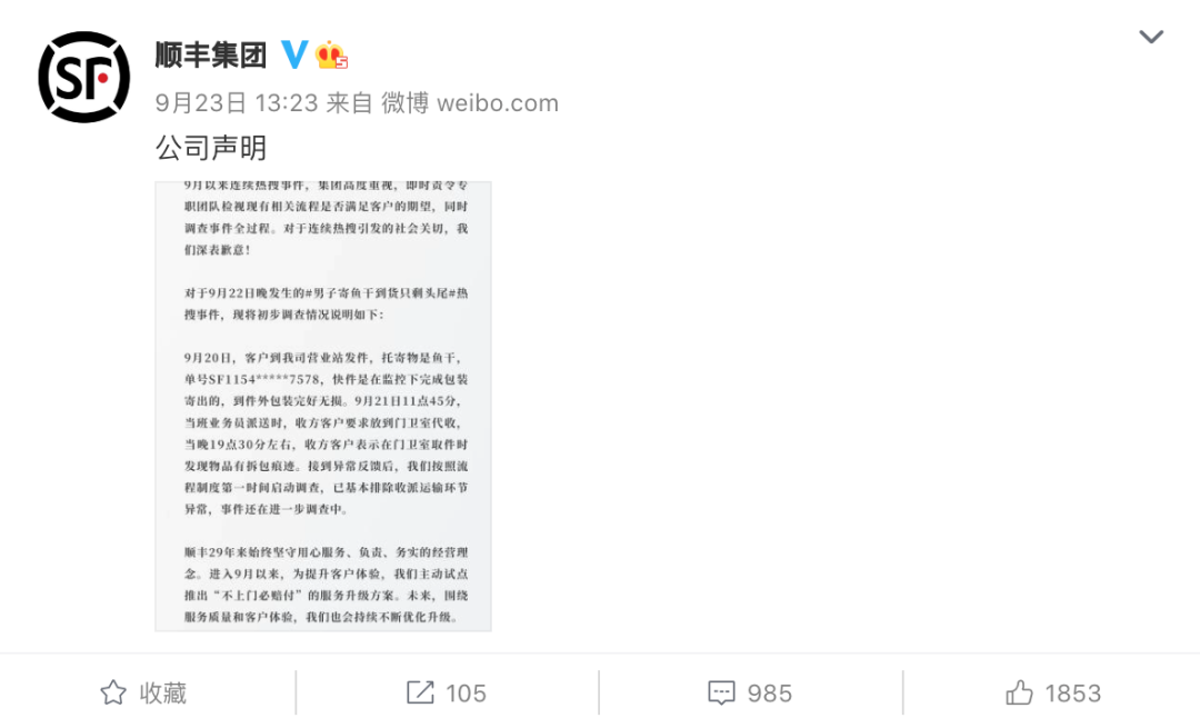 面對(duì)接二連三的熱搜,2022年9月23日,順豐官方發(fā)布聲明稱,“已責(zé)令專職團(tuán)隊(duì)檢視現(xiàn)有相關(guān)流程是否滿足客戶的期望,同時(shí)調(diào)查事件全過(guò)程”。不過(guò)一個(gè)月已經(jīng)過(guò)去,順豐并沒(méi)有公布相應(yīng)的調(diào)查結(jié)果。