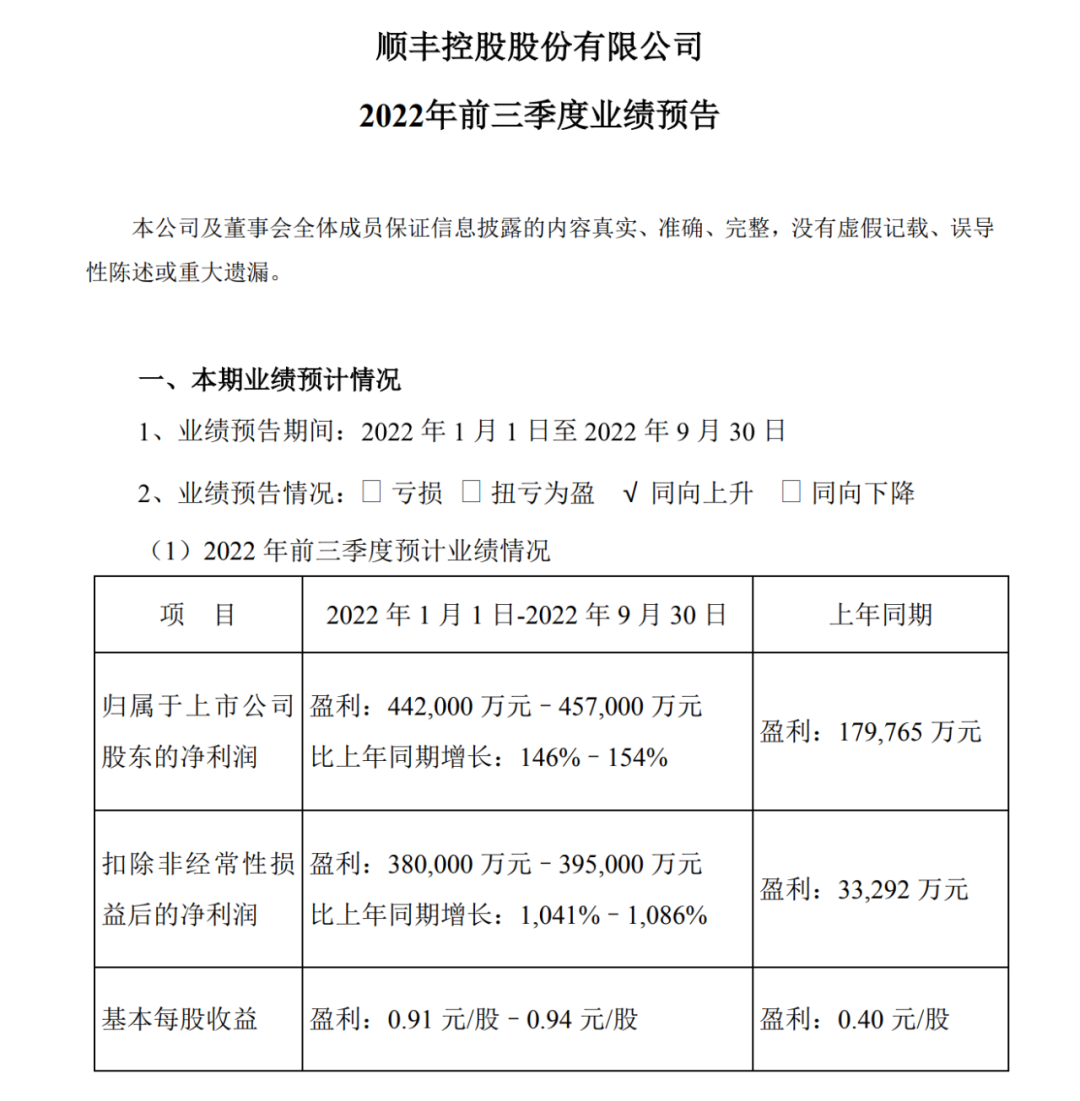 2022年10月13日晚,順豐披露了2022年前三季度業(yè)績(jī)預(yù)告,歸屬上市公司股東的凈利潤(rùn)為44.2億元-45.7億元,同比增長(zhǎng)146%-154%;歸屬上市公司股東的凈利潤(rùn)預(yù)計(jì)為19.1-20.6億元,同比增長(zhǎng)84%-99%。