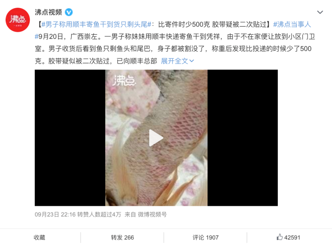 這些事情還沒(méi)完,《沸點(diǎn)視頻》又報(bào)道,2022年9月20日,廣西崇左一消費(fèi)者表示,用順豐寄送魚(yú)干,結(jié)果收到貨后,僅剩魚(yú)頭和尾巴,身子被割沒(méi)了,“膠帶疑似被二次貼過(guò)”。