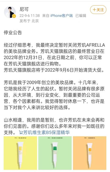 9月6日,品牌芳璣創(chuàng)始人尼可在微博宣布暫時關(guān)閉芳璣AFRELLA的美妝品牌業(yè)務(wù)。并且,芳璣天貓旗艦店將于9月6日開始清貨大促,最終營業(yè)日為2022年12月31日,在此期間,消費者可以在芳璣旗艦店正常購物。