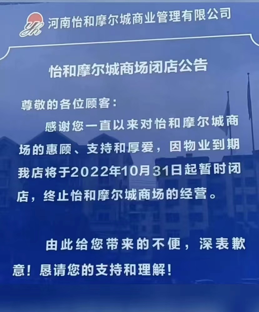根據(jù)河南怡和摩爾城商業(yè)管理有限公司發(fā)布的閉店公告,因物業(yè)到期,信陽怡和摩爾城將于2022年10月31日起暫時閉店,終止怡和摩爾城商場的經(jīng)營。