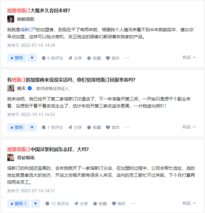 而從知乎來看,不少自稱是塔斯汀加盟商的網(wǎng)友,紛紛為該品牌站臺,提及“不到半年就回本”“準(zhǔn)備加盟三家店”“幫忙選址”“生意好到忙不過來”……