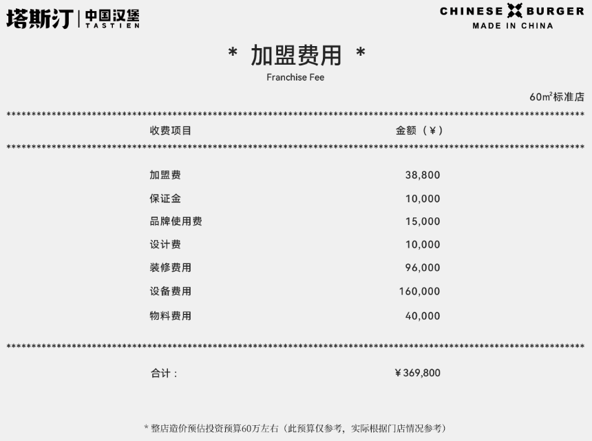 對照塔斯汀的官網(wǎng)信息,該品牌也開放了對外加盟。資料顯示,塔斯汀只開放單店加盟合作方式,以一家60㎡的標(biāo)準(zhǔn)店計算,加盟費用合計需要369800元。