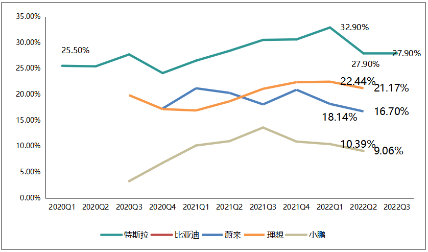 先從毛利率水平來(lái)看,由于蔚小理2022Q3的數(shù)據(jù)尚未披露,比亞迪季度不拆分汽車業(yè)務(wù),因此以2022Q2為準(zhǔn),對(duì)比特斯拉與蔚小理三家:特斯拉毛利率為27.9%,其次為理想21.17%,小鵬的毛利率水平最低。
