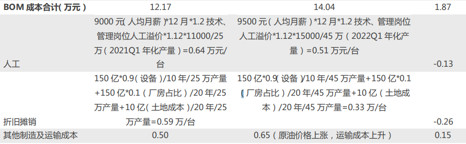 以特斯拉Modle3為例,規(guī)模化降本的部分主要計(jì)算人工成本及攤銷,按照申萬(wàn)宏源證券對(duì)于2022Q1特斯拉中國(guó)工廠的人工和折舊攤銷成本的算法: