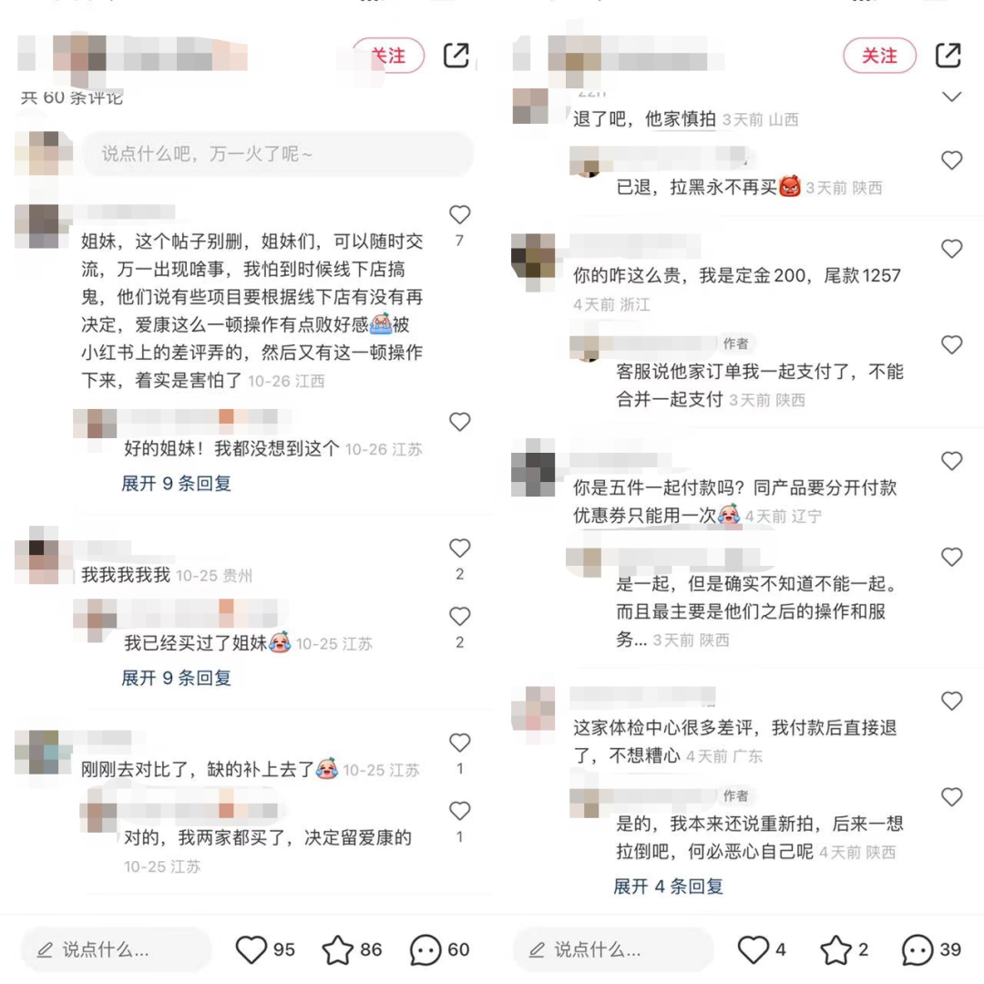 在一篇題為“愛康國賓雙十一真的很下頭”的分享帖中,博主也講到了這次時(shí)間的緣由:愛康國賓在李佳琪直播間的體檢項(xiàng)目有刪減。經(jīng)過這番“偷偷改項(xiàng)目”、“換來換去”的行動(dòng),哪怕愛康國賓的體檢套餐最終將項(xiàng)目配齊了,仍給消費(fèi)者留下了“做不起活動(dòng)就不要做”的不佳印象。