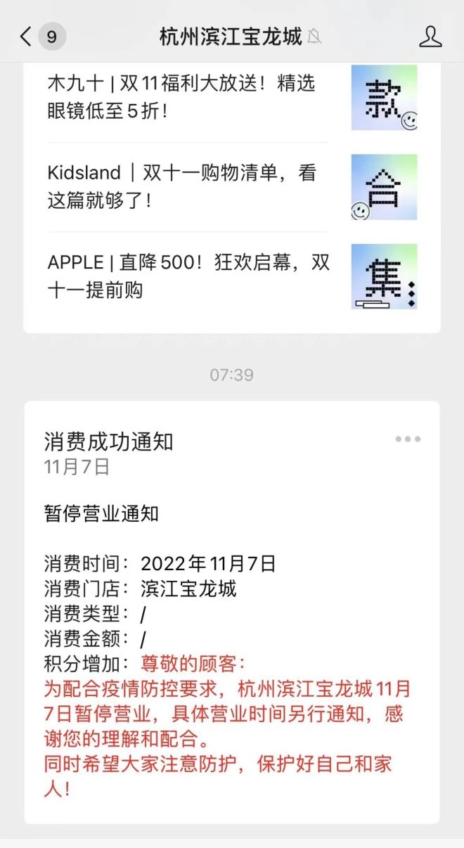 杭州濱江寶龍城11月7日暫停營業(yè)