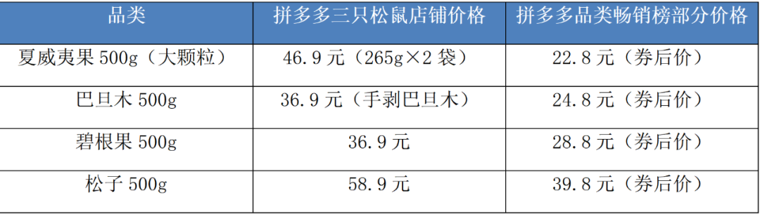 陸玖商業(yè)評論選取拼多多三只松鼠店鋪的同規(guī)格產(chǎn)品,和品類暢銷榜差不多的店鋪相對比,三只松鼠價格貴并非個例。