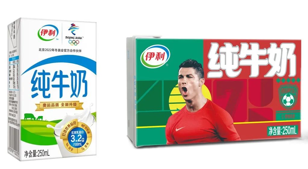 我們看到伊利在幾天前推出了一個(gè)“夢(mèng)之隊(duì)限量裝”純牛奶。名字聽上去挺普通,但它設(shè)計(jì)了一套“預(yù)測(cè)贏球”的玩法。把奶買回家之后,你可以直接把帶有阿根廷隊(duì)、西班牙隊(duì)、C羅等球隊(duì)和球星的包裝放到外箱上拍照,曬出你pick的贏家。