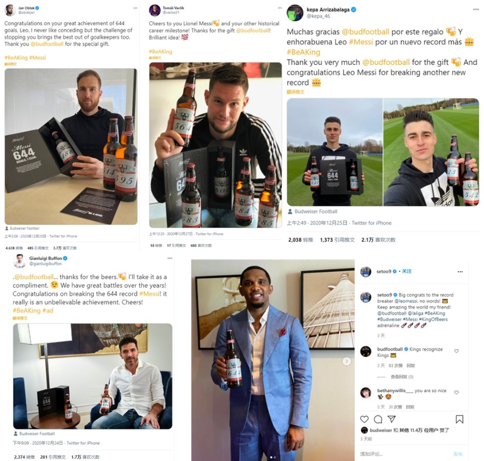 那年12月23日,西甲聯(lián)賽第15輪比賽,梅西踢進(jìn)了他為巴塞羅那隊(duì)進(jìn)的第644球,打破了上世紀(jì)貝利創(chuàng)下的“單一俱樂部進(jìn)球數(shù)”世界紀(jì)錄,而作為梅西商業(yè)伙伴的百威,馬上很“損”地定制了644瓶啤酒送給被梅西進(jìn)過球的160位門將。這個(gè)動(dòng)作不僅獲得了大量球星的傳播,還在民間誕生了很多梗,在Twitter與Instagram上獲得百萬點(diǎn)贊與轉(zhuǎn)發(fā)[5]。