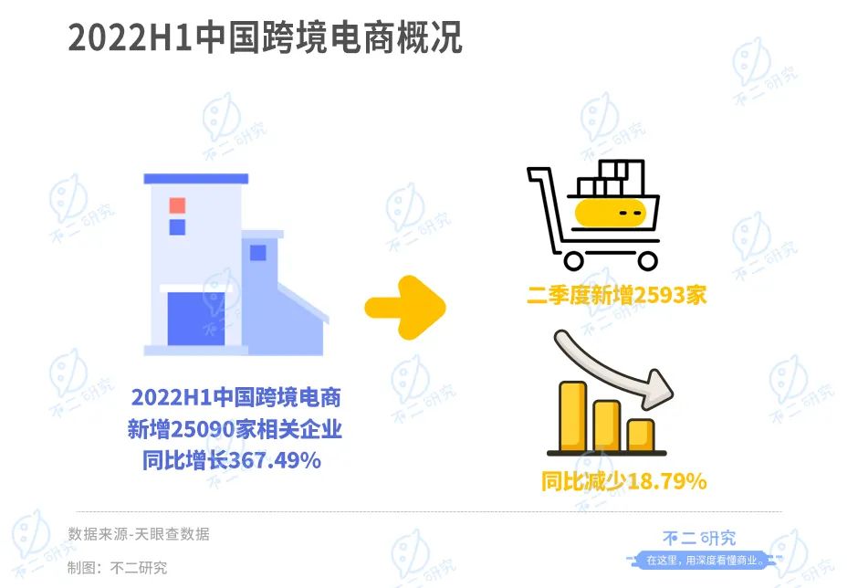 據(jù)天眼查數(shù)據(jù)顯示,2022上半年全國共新增25090家跨境電商相關(guān)企業(yè),同比增長367.49%。其中,二季度新增2593家,同比減少18.79%。