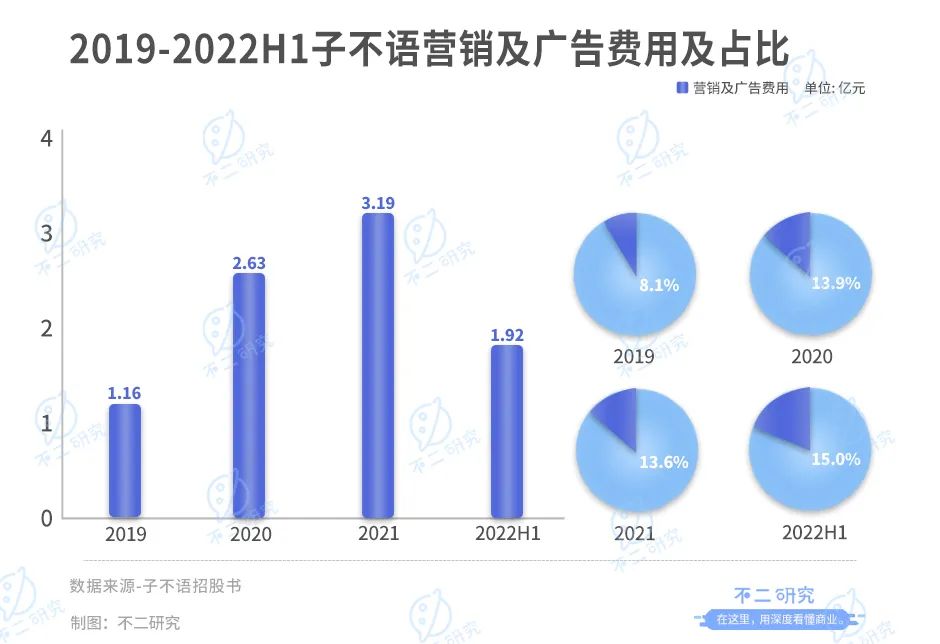 時隔五年,子不語再次站在資本市場的聚光燈下:2019-2021年,子不語營收逐年增加,2020年營收近19億;但同期的營銷費用也逐年增加,2020年的營銷及廣告費用為2.63億元。