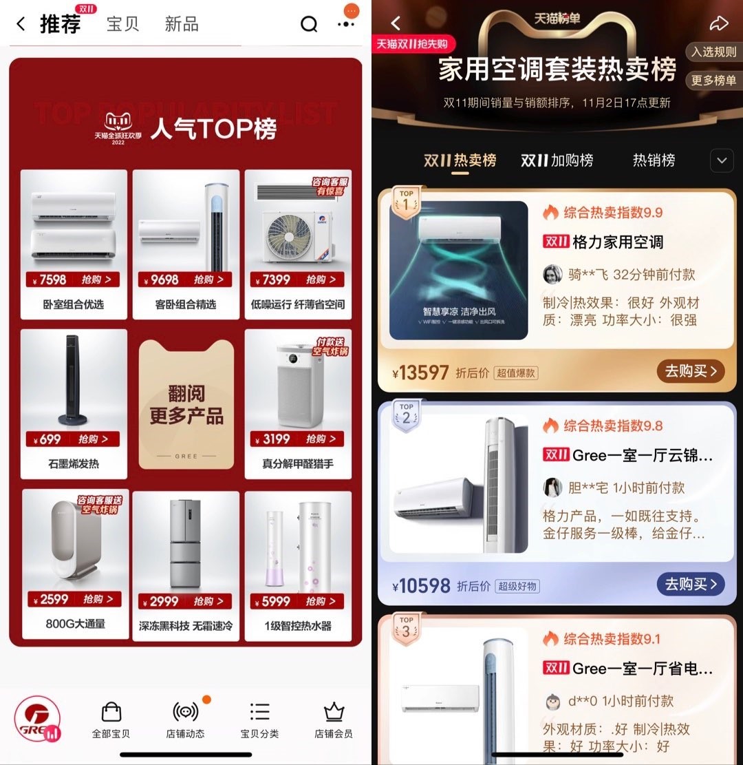 以格力為例,在格力天貓官方旗艦店首頁的人氣TOP榜中,16款單品的價格在649-9999之間,售價最低的商品為649元的石墨烯折疊取暖器,而市面上普通取暖器的價格在200-400元不等。主力產(chǎn)品空調(diào)則強(qiáng)調(diào)UVC除菌、嵌入式、手機(jī)智控等技術(shù)優(yōu)勢,價位比店鋪熱賣的一款售價2899元(折后)的變頻空調(diào)高出許多。