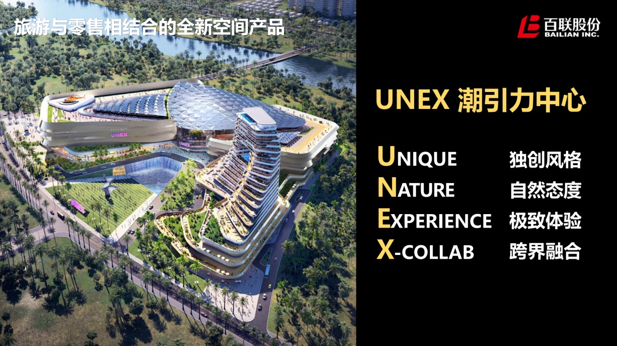 作為地方國企,百聯(lián)積極投身“全面建設(shè)海南自貿(mào)港”的國家戰(zhàn)略。百聯(lián)股份創(chuàng)新探索“商業(yè)+旅游”模式,打造旅游與零售相結(jié)合的全新空間產(chǎn)品——UNEX潮引力中心(UNEX即UNIQUE、NATURE、EXPERIENCE、X-COLLABORATION)。作為成為深化滬瓊合作的重要戰(zhàn)略項目之一。UNEX將充分發(fā)揮百聯(lián)股份個性化空間商業(yè)的實踐經(jīng)驗,讓高品質(zhì)、個性化的生活方式在自然、藝術(shù)、數(shù)字、科技與商業(yè)的結(jié)合中充滿張力。