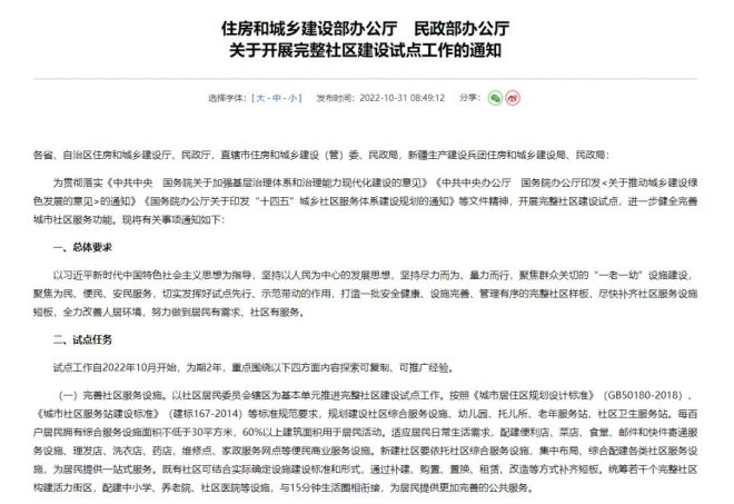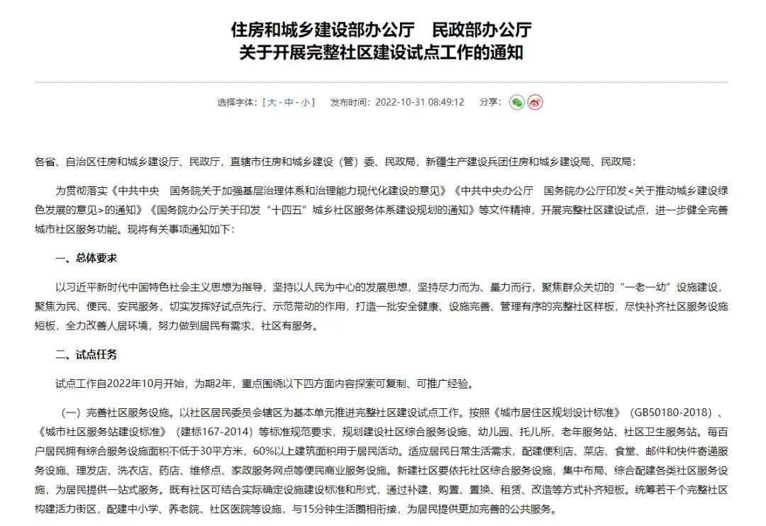 10月底,住建部、民政部聯(lián)合發(fā)布《關(guān)于開展完整社區(qū)建設(shè)試點(diǎn)工作的通知》,提出各市區(qū)應(yīng)選取3至5個(gè)社區(qū)開展完整社區(qū)建設(shè)試點(diǎn),試點(diǎn)社區(qū)應(yīng)規(guī)劃建設(shè)社區(qū)綜合服務(wù)設(shè)施、幼兒園、老年服務(wù)站、食堂等系列便民商業(yè)服務(wù)設(shè)施,試點(diǎn)時(shí)間自2022年10月開始,為期2年。