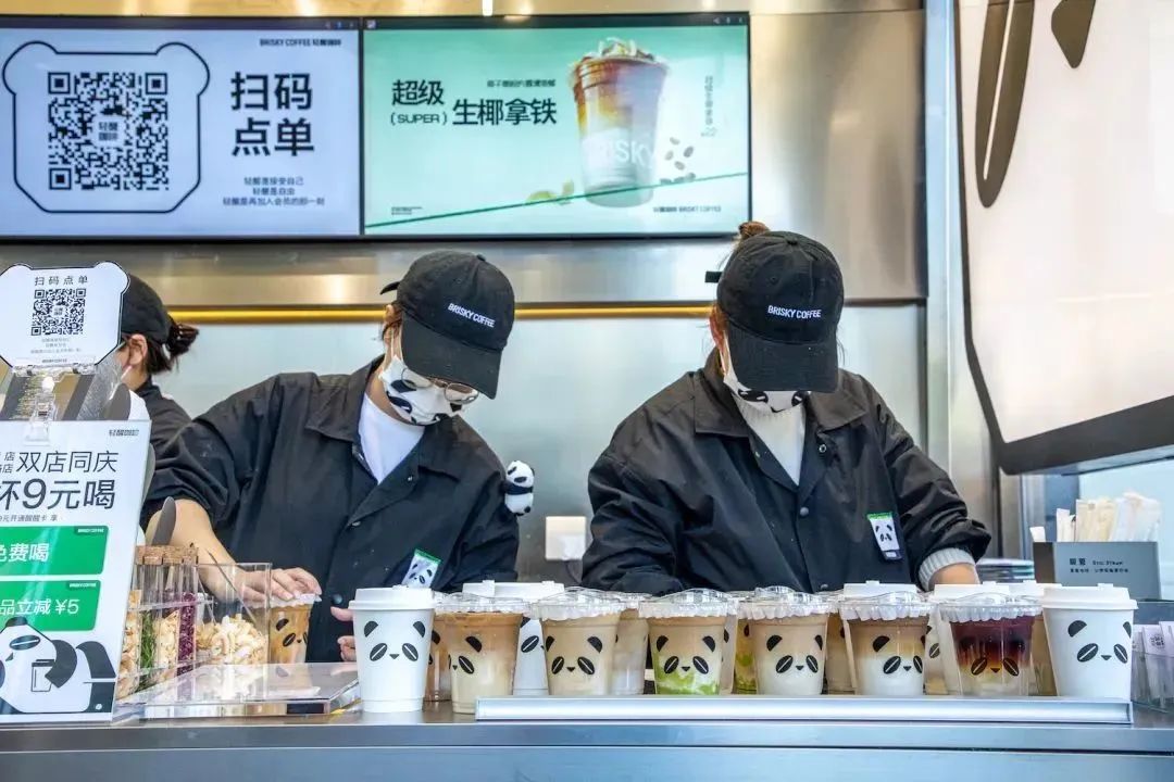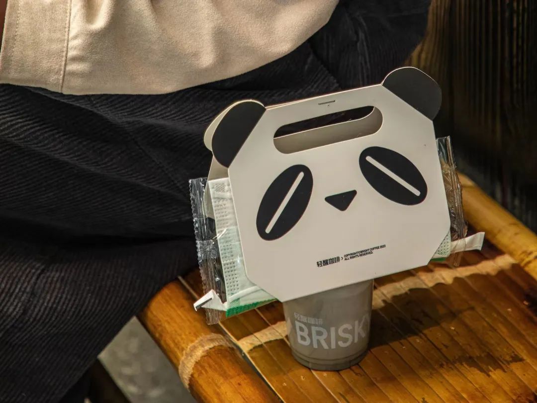 “但我們給熊貓做了創(chuàng)新,做了一個方型熊貓,眼睛是兩顆咖啡豆,非常有辨識度,為此專門做過調查,門店的熊貓頭像,以及杯子、杯套、口罩等成圖率最高能超過70%!