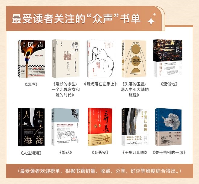 本次冬日書單還收錄了第四季“多多讀書月”里的眾聲書單。麥家的《風聲》、孫甘露新作《千里江山圖》、李偉長所著閱讀隨筆集《未被摧毀的生活》及羅新的《漫長的余生:一個北魏宮女和她的時代》等作品悉數在列。