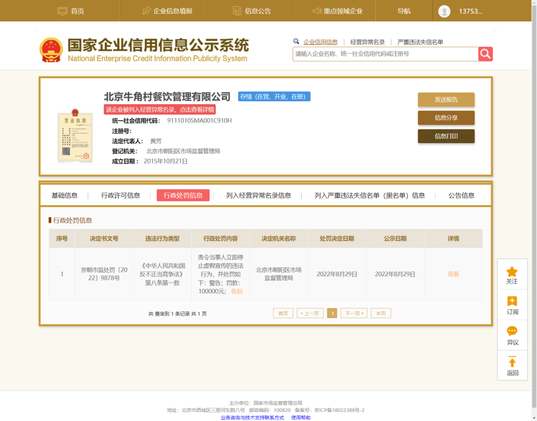 根據(jù)國家企業(yè)信用信息公示系統(tǒng),牛角村的運(yùn)營主體「北京牛角村餐飲管理有限公司」已被列為列為經(jīng)營異常名錄。原因?yàn)橥ㄟ^登記的住所或者經(jīng)營場所無法聯(lián)系,列入時(shí)間為2022年10月31日